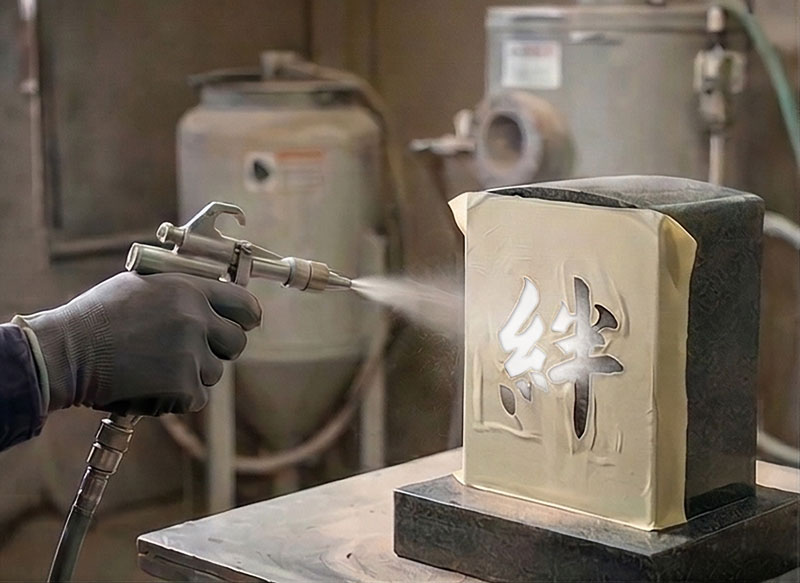 | Step.3 墓石の彫刻・塗装 弊社提携の工房にて、一つ一つ丁寧に彫刻・塗装させて頂きます。 |